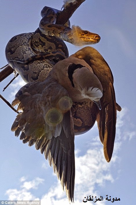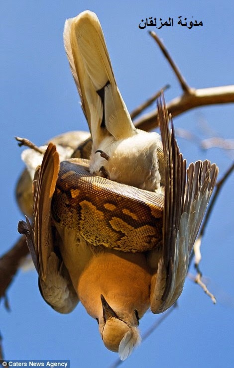 وكان هذا المتربص ثعبان ضخم . تسلق الشجرة رغم الأشواك في دقائق معدودة وبحذر شديد . وإن هي إلا لمحة من البصر حتى إنقض على الحمامة وعصرها بين عضلاته القوية وجلده الناعم الملمس ؛ ثم ليبتلعها في جوفه طعاماً هنيئاً مريئا ...