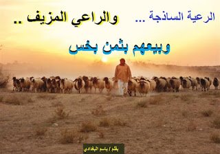 وفي العراق مثلا نرى من تصدر لقيادة الرعية بالتزييف والكذب والنفاق والتزوير وجر الرعية للهلاك بمواقفه وافعاله وفتاويه التي حشدت الاخ ان يقتل اخيه وسيطرة الظالم على زمام الامور في العراق فأخذ مأخذه من الرعية بالويل والثبور والقتل والتهجير وسرقة الممتلكات و من جرائم يندى لها جبين الانسانية علما ان الراعي بعد ان اوصل الرعية الى الهلاك والدمار انزوى في جحره وترك الرعية بين ذئاب البشر وهذا الراعي المزيف الذي صنعه الاعلام هو السيستاني رجل المخابرات الغامض في دخوله للعراق وتصدره المشهد وهو لايملك علم او ثقافة دينية تؤهله لقيادة الامة .