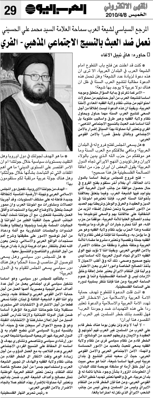 - فتح فروع للمجلس يرتبط اساسا بالدول ذات العلاقة، أي بکلام آخر سنقوم بفتح الفروع في حال حصول موافقة من جانب الدول العربية التي يتواجد فيها الشيعة العرب. وفيما يتعلق بعلاقتنا بأخواننا السنة العرب، فإننا نعتبرهم اخوتنا في الدين والعقيدة و العرق و الوطن و تربطنا بهم العديد من الامور المصيرية ونحن نحاول إضفاء المزيد من الشفافية على علاقاتنا بهم و السعي لتوطيدها بما يخدم المصالح العليا للأمة العربية. موقفنا من حزب الله، هو أننا نحترم خيارات أي طرف وما يرتضيه لنفسه وهذا الحزب يؤيد نظام ولاية الفقيه وهو حر في مايؤمن به، وبالنسبة لنا فإننا نرفض نظام ولاية الفقيه جملة و تفصيلا ونعتبره مشروعا مضادا للأمة العربية و حلقة خطيرة و مقلقة من حلقات الاضرار بالامن القومي العربي. ويقينا اننا لا نؤيد نهج الولي الفقيه الايراني تجاه الدول العربية لأنه اساسا ليس بنهج صحيح و صحي، ذلك أنه وفي أغلب الاحيان لا يؤخذ في الاعتبار المصالح الخاصة و امور اخرى بنظر الاعتبار. وبرأينا فإن النظام الايراني يعتبر عامل إعاقة و خلق الازمات ليس في الساحة الفلسطينية وانما في عموم الساحة العربية ومن هنا فإننا ننظر بسلبية لدوره على الساحة الفلسطينية.