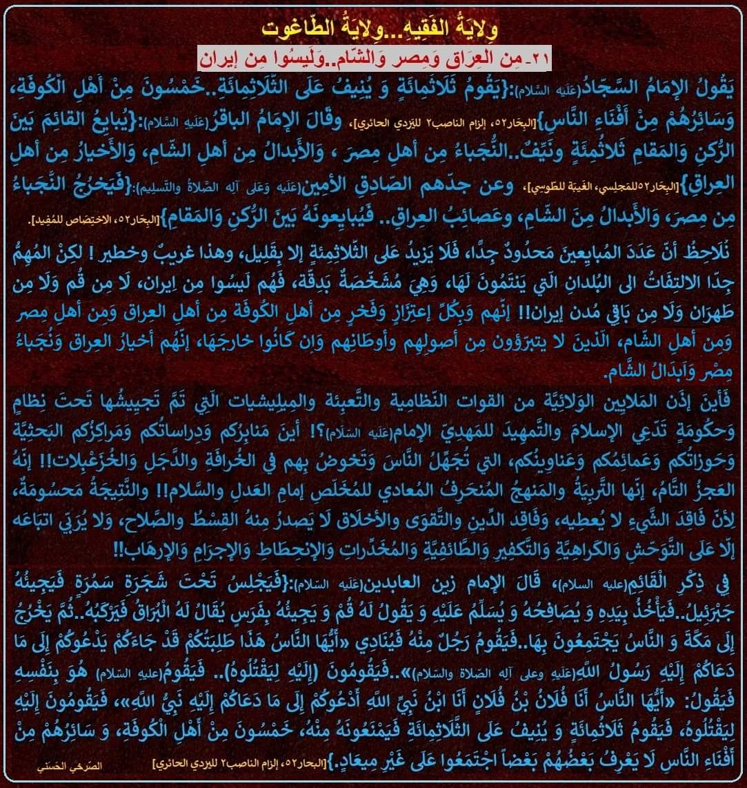 ٢١- مِن العراق و مصر و الشام .. وليسوا من ايران يقول الإمام السجاد ( عليه السلام ) : { يقوم ثلاثمائة ونيف على الثلاثمائة .. خمسون من اهل الكوفة , وَسَائِرُهُمْ من افناء الناس } [ البحار 52 , إلزام الناصب 2 لليزدي الحائري ] , وقال الإمام الباقر ( عليه السلام ) : { يُبايع القائم بين الركن والمقام ثلاثمئة ونيف .. النجباء من اهل مصر , والابدال من اهل الشام , والاخيار من اهل العراق } [ البحار 52 للمجلسي , الغيبة للطوسي ] , وعن جدهم الصادق الامين ( عليه وعلى آله الصلاة والتسليم ) : { فيَخرُجُ النجباء من مصر , والابدال من الشام , وعصائب العراق .. فيُبايعونه بين الركن والمقام } [ البحار 52 , الاختصاص للمفيد] . نلاحظ أن عَدد المُبايعين محدود جداً , فلا يزيد على الثلاثمئة إلا بقليل , وهذا غريب وخطير ! لكن المهم جداً الالتفات الى البلدان التي ينتمون لها , وهي مُشخصةٌ بدقة , فهم ليسوا من ايران , لا من قُم ولا من طهران ولا من باقي مُدن إيران !! إنهم وبكل إعتزاز وفخر من أهل العراق ومن أهل مصر ومن أهل الشام , الذين لا يتبرؤون من اصولهم واوطانهم وان كانوا خارجها , إنهم أخيار العراق ونجباء مصر وابدال الشام. فأين إذن الملايين الولائية من القوات النظامية والتعبئة والميليشيات التي تم تجييشها تحت نظام وحكومة تَدّعي الإسلام والتمهيد للمهدي الإمام ( عليه السلام ) ؟! أين منابركم ودراساتكم ومراكزكم البحثية وحوزاتكم وعمائمكم وعناوينكم , التي تُجَهَّلُ الناس وتخوض بهم في الخرافة والدجل والخزعبلات !! إنه العجز التام , إنها التربية والمنهج المنحرف المعادي للمُخَلّصِ إمام العدل والسلام!! والنتيجة محسومة , لأن فاقد الشيء لا يُعطيه , وفاقد الدين والتقوى والأخلاق لا يصدر منه القِسط والصلاح , ولا يُربي اتباعه إلا على التوحش والكراهية والتكفير والطائفية والمخدرات والإنحطاط والإجرام والإرهاب!! في ذكر القائم ( عليه السلام ) , قال الإمام زين العابدين ( عليه السلام ) : { فيَجلسُ تحت شجرة سمرة فيجيئه جبرئيل .. فيَأخذ بيده ويُصافحه ويُسلمُ عليه ويقول له قُمْ ويجيئهُ بفرس يُقال له البراق فيركبه .. ثم يخرج الى مكة والناس يجتمعون بها .. فيقومُ رجلٌ منه فيُنادي (( أيها الناس هذا طِلَبَتُكمْ قد جاءكم يدعوكم الى ما دعاكم اليه رسول الله ( عليه وعلى آله الصلاة والسلام ) )).. فيقومون ( إليه ليقتلوه ) .. فيقوم ( عليه السلام ) هو بنفسه فيقول : (( أيها الناس أنا فلان بن فلان أنا ابن نبي الله أدعوكم الى ما دعاكم اليه نبي الله )) , فيقومون اليه ليقتلوه , فيقوم ثلاثمائة ويُنيفُ على الثلاثمائة فيمنعونه منه , خمسون من اهل الكوفة , وَسَائِرُهُمْ من افناء الناس لا يعرف بعضهم بعضاً اجتمعوا على غير ميعاد }.(البحار 52 ,إلزام الناصب لليزدي الحائري))