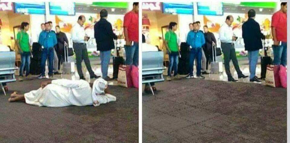 إن أكبر دليل على فبركة هذه الصورة هو أن سلطات المطار في دول الخليج كافة لا تسمح للمسافر بأن يستلقى لينام بهذه الطريقة على الأرض ..