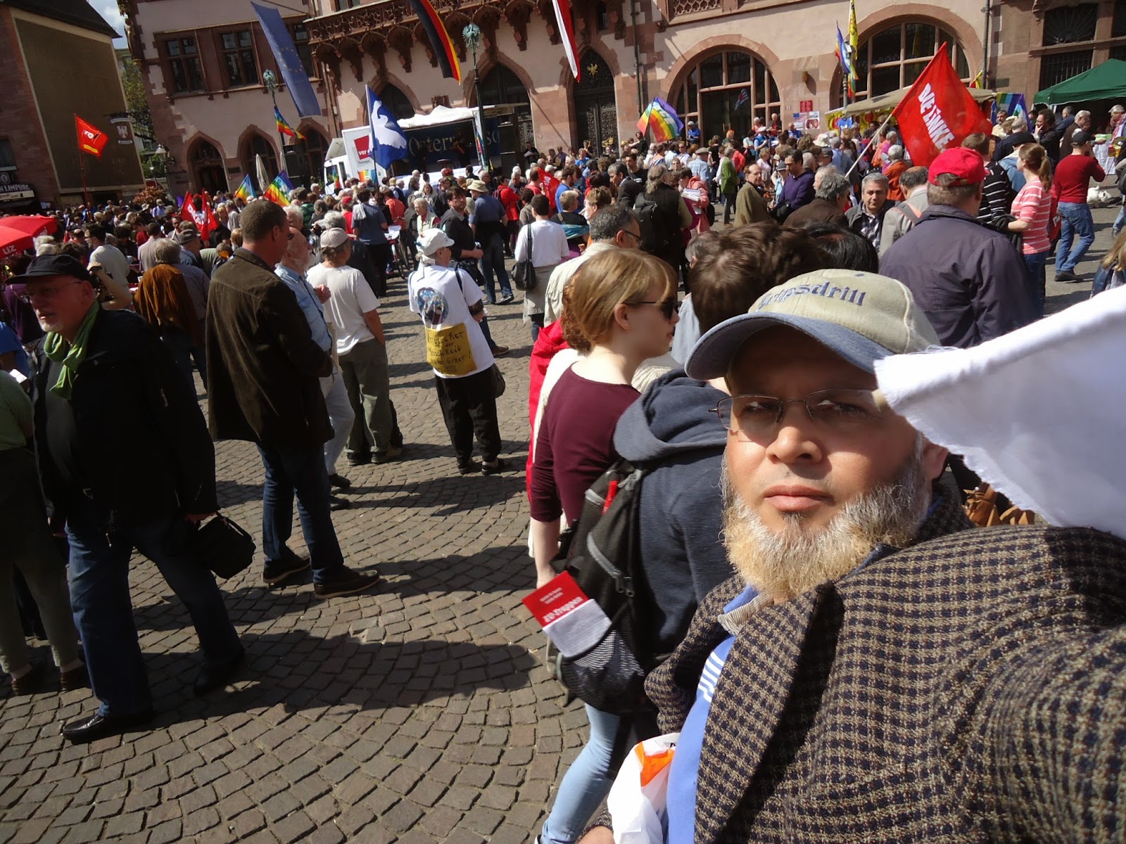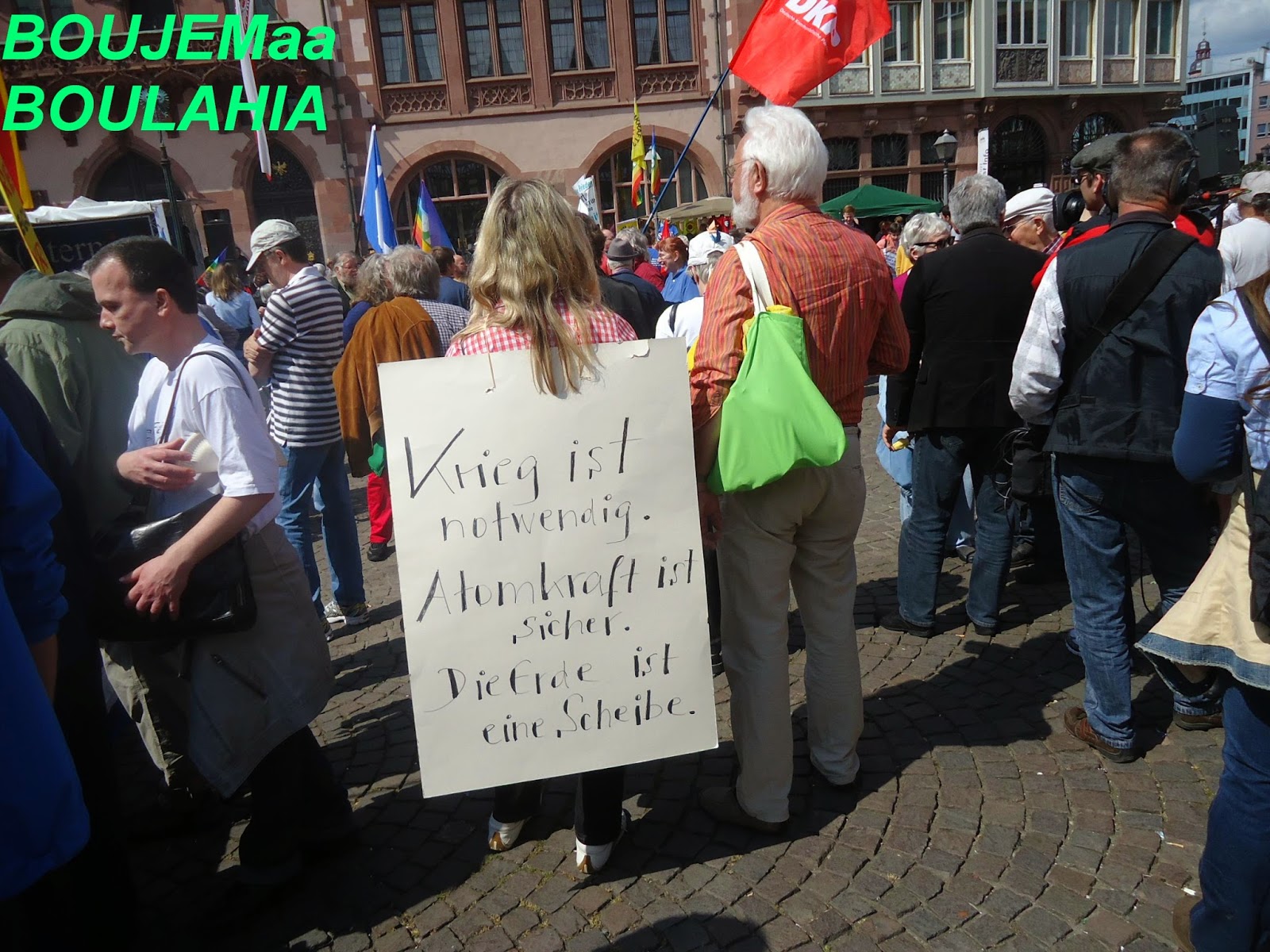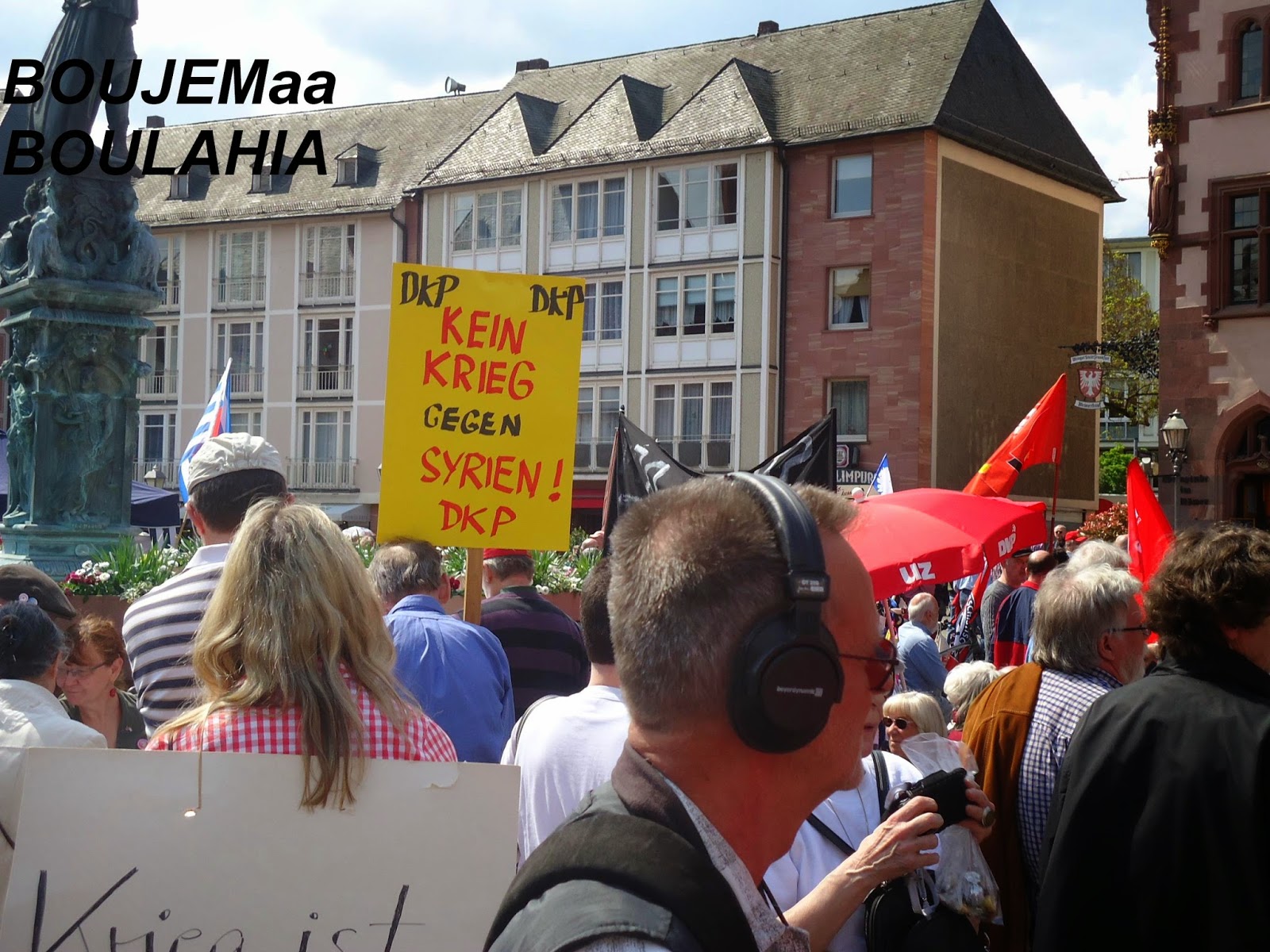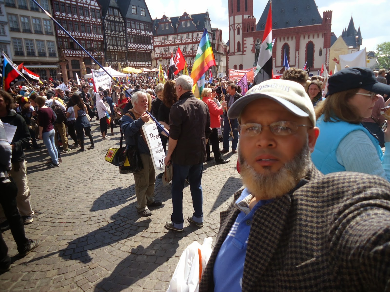 و بمناسبة عيد الفصح المسيحي، نظم عدد من نشطاء " السلام" أكثر من فعالية احتفاء بهذا اليوم,و طالب متظاهرون في وقفة احتجاجية أقيمت صباح اليوم أمام الكنيسة الكاثولكية بفرانكفورت بوقف الحرب في كييف,سوري,العراق,لبنان وفي العالم أجمع.وقالوا:"نحن ندعو للمقاومة الشعبية السلمية من أجل السلام في أوروبا والعالم". كما نادوا بضرورة إلغاء التنافس والصراع التنافسي بين الإنسان والإنسان. وحملوا لافتات مكتوب عليها الموت للاشتراكيين والرأسماليين وسياسييهم وصحافتهم. وحمل المشاركون في المضاهرة صورا للأطفال ضحايا الحروب. واعلام الدول التي تقع فيها الحروب. كما حمل احدهم صورا للالات الحربيه والعسكريه. و الغريب في الأمر هو اننى لم ارى ولو عربيا واحد يشارك في هذه الفعاليات والمسيرة التي شارك فيها العشرات من النشطاء المدنيون ورجال الدين والصحفيون لنبذ العنف ضد الحروب في المناطق المختلفة من العالم محاولة منهم لإيقاف نزيف الدم وتجنيب العالم ويلات حرب عالمية جديدة، كالتي مرت علينا في خواتيم العشرينات من القرن الماضي التي ضربت العالم بأزمة الكساد الاقتصادي التي تسببت فيها الرأسمالية العمياءو المتوحشة.