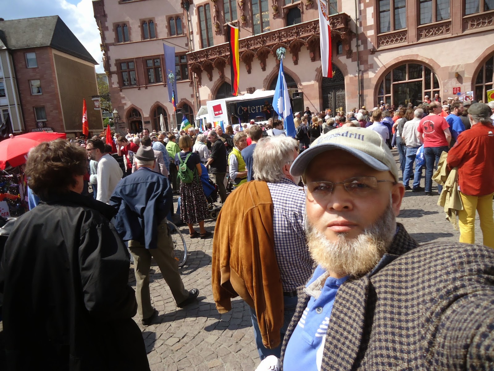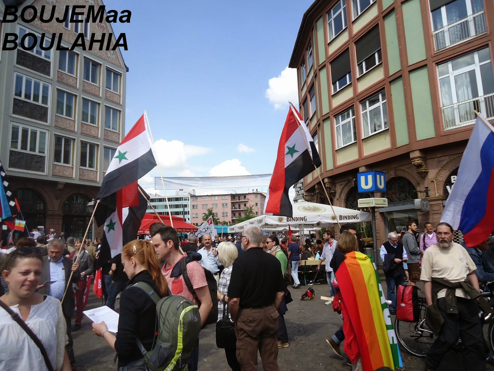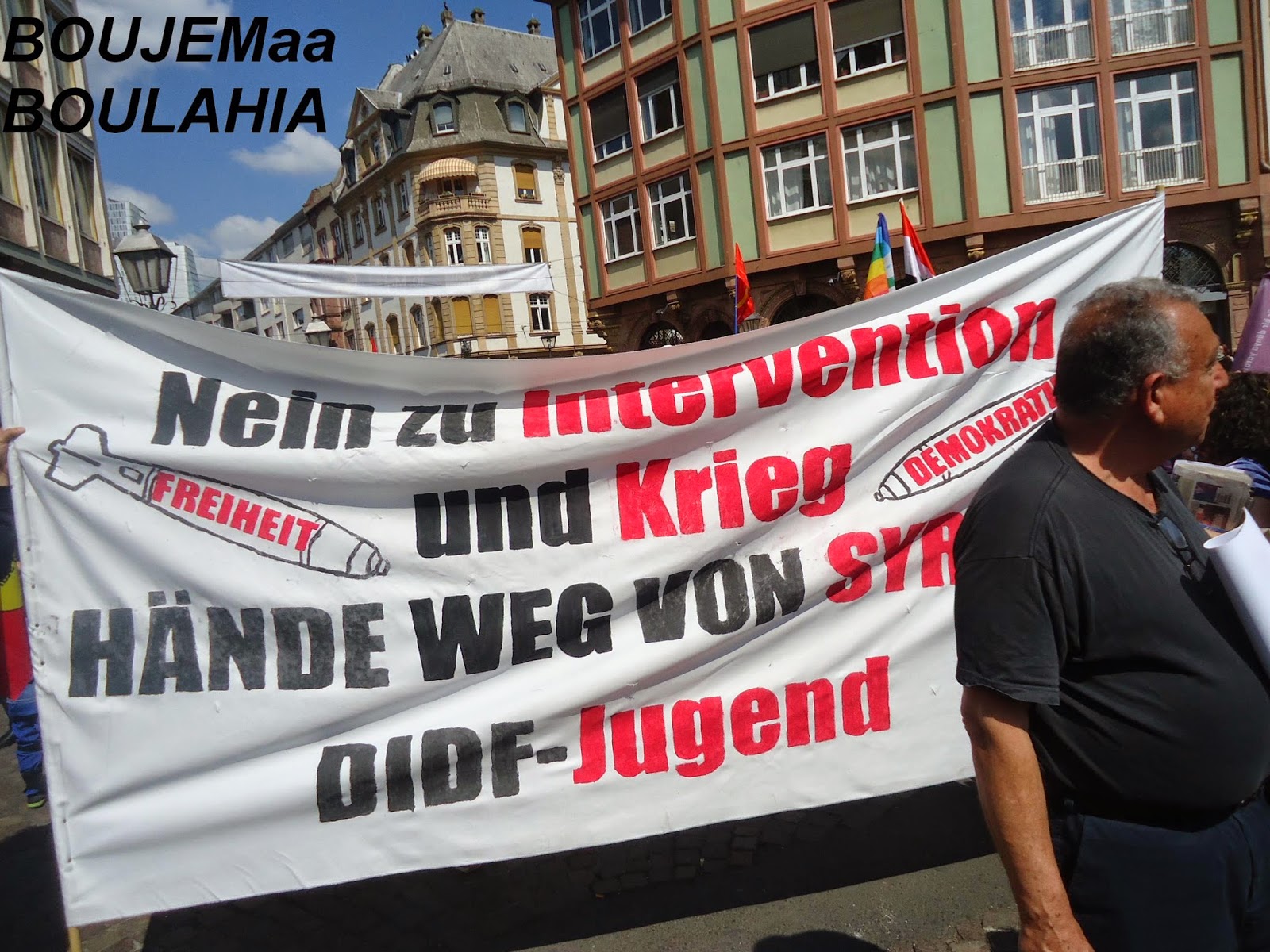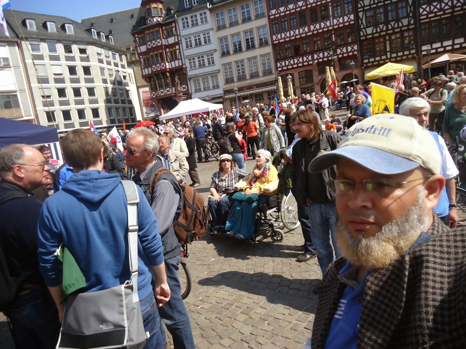 و بمناسبة عيد الفصح المسيحي، نظم عدد من نشطاء " السلام" أكثر من فعالية احتفاء بهذا اليوم,و طالب متظاهرون في وقفة احتجاجية أقيمت صباح اليوم أمام الكنيسة الكاثولكية بفرانكفورت بوقف الحرب في كييف,سوري,العراق,لبنان وفي العالم أجمع.وقالوا:"نحن ندعو للمقاومة الشعبية السلمية من أجل السلام في أوروبا والعالم". كما نادوا بضرورة إلغاء التنافس والصراع التنافسي بين الإنسان والإنسان. وحملوا لافتات مكتوب عليها الموت للاشتراكيين والرأسماليين وسياسييهم وصحافتهم. وحمل المشاركون في المضاهرة صورا للأطفال ضحايا الحروب. واعلام الدول التي تقع فيها الحروب. كما حمل احدهم صورا للالات الحربيه والعسكريه. و الغريب في الأمر هو اننى لم ارى ولو عربيا واحد يشارك في هذه الفعاليات والمسيرة التي شارك فيها العشرات من النشطاء المدنيون ورجال الدين والصحفيون لنبذ العنف ضد الحروب في المناطق المختلفة من العالم محاولة منهم لإيقاف نزيف الدم وتجنيب العالم ويلات حرب عالمية جديدة، كالتي مرت علينا في خواتيم العشرينات من القرن الماضي التي ضربت العالم بأزمة الكساد الاقتصادي التي تسببت فيها الرأسمالية العمياءو المتوحشة.