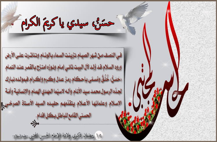 في النصف من شهر الصيام، تزينت السماء بالوئام، وتناثرت على الأرض ورود السلام، قد وُلِد لآل البيت ثاني إمام، ونورُه امتزج بالقمر عند التمام، (حَسَنُ) خُلُقٌ ومُسمّى بإحكام، رمز عدل وكرم وإكرام، فبمولده نبارك لجدّه الرسول محمد سيد الأنام، وآله لاسيّما المهدي الهمام، والإنسانية وأمّة الإسلام، وعلمائها الأعلام، يتقدّمهم حفيده السيد الأستاذ الصرخي الحسني القامع للباطل بكل إقدام.
