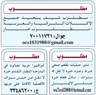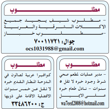 مطلوب شيف يجيد جميع المأكولات الشرقية والغربية.